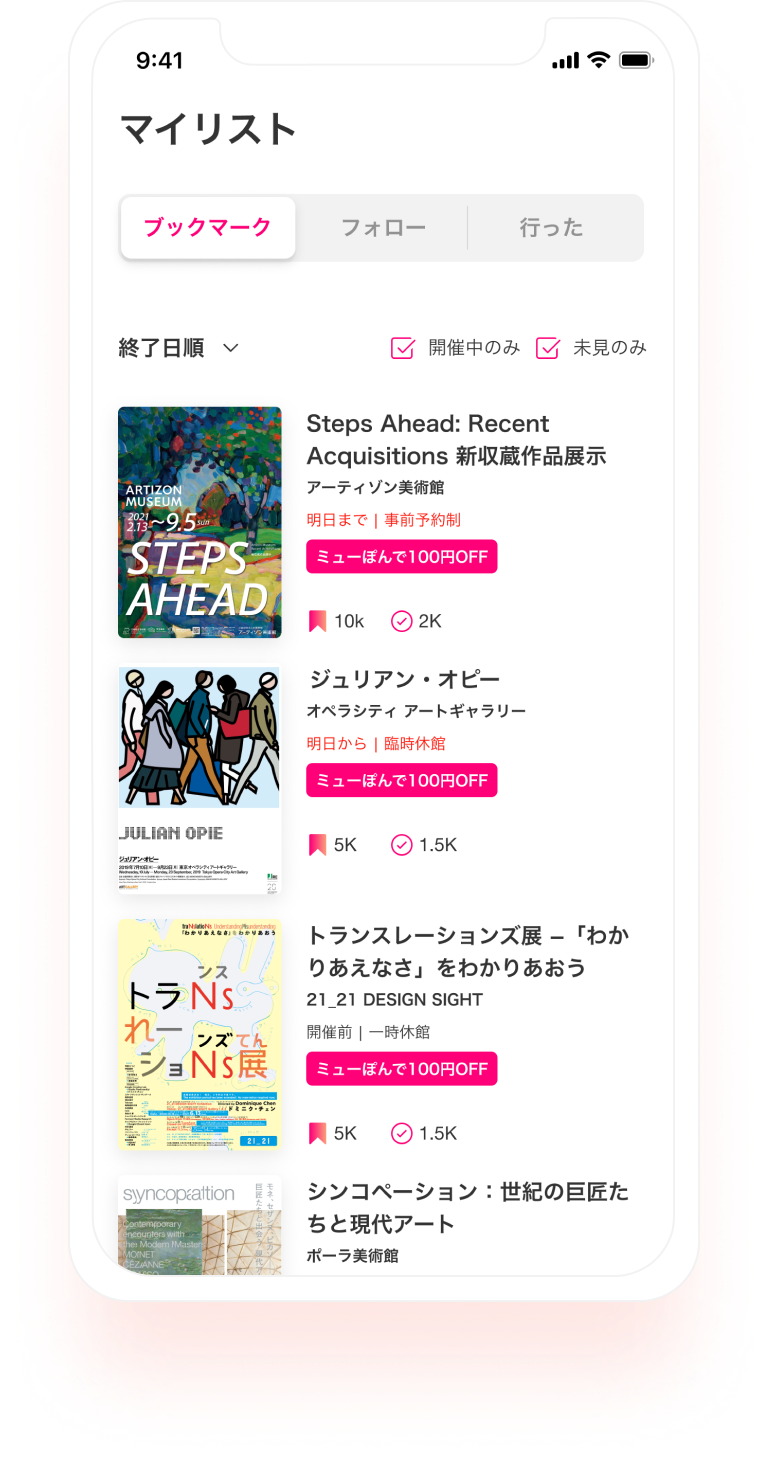 お気に入りの美術館・ギャラリーをフォローすれば、開催中の展覧会の見逃しを防げます。