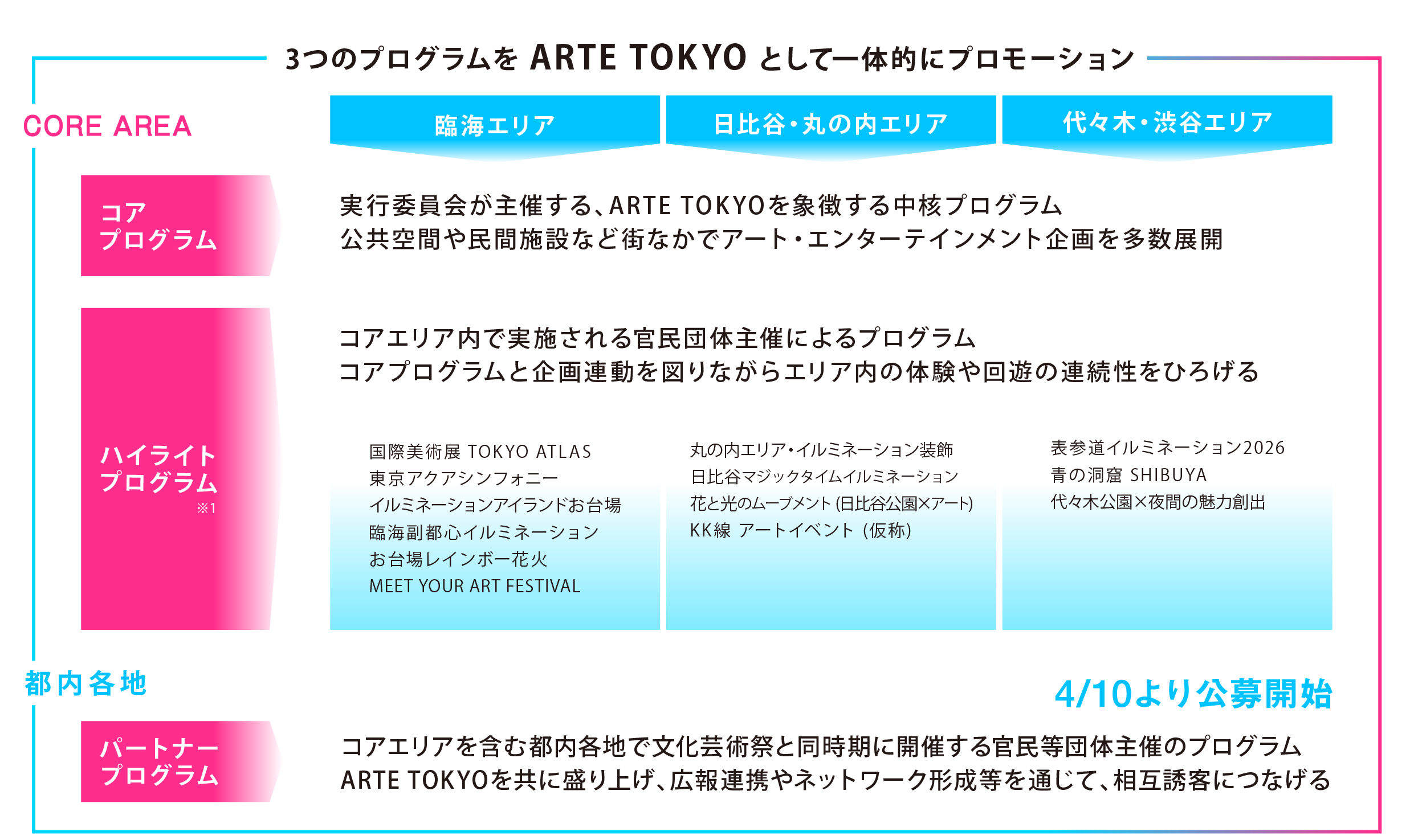 初開催となる2026年は、臨海エリア、日比谷・丸の内エリア、代々木・渋谷エリアをコアエリアとし、様々な催しと連動しながら、東京2020大会文化プログラムのリバイバルをはじめとする多数の企画を街なかで展開する。3エリアでは、「ARTE TOKYO」を象徴する「コアプログラム」として、実行委員会主催のアート・エンターテインメント企画を街なかで多数行うほか、官民団体主催によるプログラムを「ハイライトプログラム」として実施。さらにコアエリアを含む都内各地で、公募による様々な「パートナープログラム」を開催する。